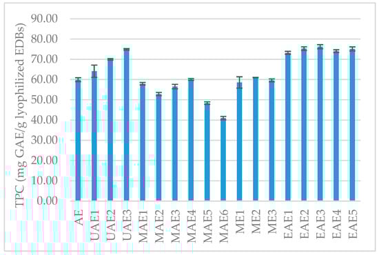 TPC content expressed as mg of GAE/g lyophilized EDBs. Values are reported as mean (n = 3) ± standard deviation indicated in the columns by error bars (TPC—total phenolic content; GAE—gallic acid equivalent; EDB—elderberry; AE—continuous agitation; UAE—ultrasound-assisted extraction; MAE—microwave-assisted extraction; ME—maceration extraction; and EAE—enzyme-assisted extraction).