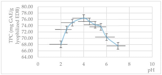 The TPC (mg of GAE/g lyophilized EDBs) of the samples obtained by EAE with Pectinex at different pH values. Values are reported as mean (n = 3) ± standard deviation indicated by error bars (TPC—total phenolic content; GAE—gallic acid equivalent; EDB—elderberry; and EAE—enzyme-assisted extraction).