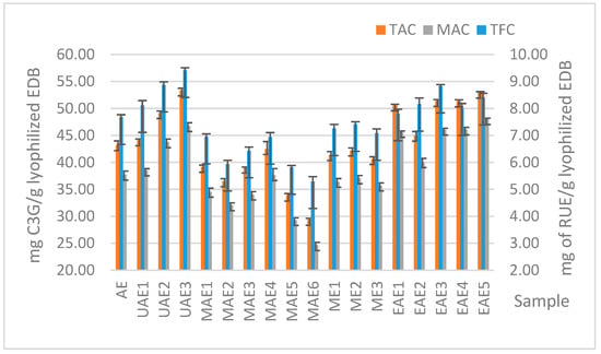 TFC (mg RUE/g lyophilized EDB), TAC, and MAC (mg C3G/g lyophilized EDB) of the extracts obtained by different methods of extraction. Values are reported as mean (n = 3) ± standard deviation indicated by error bars (TAC—total anthocyanin content; MAC—monomeric anthocyanin content; TFC—total flavonoid content; RUE—rutin equivalent; EDB—elderberry; C3G—cyanidin-3-glucoside equivalents; AE—continuous agitation; UAE—ultrasound-assisted extraction; MAE—microwave-assisted extraction; ME—maceration extraction; and EAE—enzyme-assisted extraction).