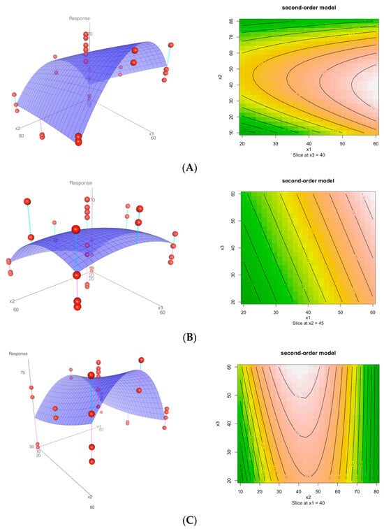 Three-dimensional response surface plots for TPC (total phenolic content) as a function of (A) X1 = temperature and X2 = solvent concentration (at a constant time of 40 min), (B) X1 = temperature and X3 = time (at a constant solvent concentration of 45% ethanol), and (C) X2 = solvent concentration and X3 = time (at a constant temperature of 40 °C).