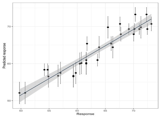 The relation between the experimental TPC data and the values predicted by the obtained model is presented in Figure 6. The results show a linear relationship (the model is significant, at p < 0.001, and explains 88.35% of the data variability) with the slope that diverges substantially from the theoretical value 1 (slope = 0.84 ± 0.06), and the origin ordinate moves away from the theoretical zero value (intercept = 12 ± 4). These results are expected since the RSM model’s determination coefficient (R2 = 0.8848) indicates that the model explains a significant portion of the variability in the response variable, and the statistically significant lack of fit (p-value of 0.019) suggests that there are some variations in the data that are not fully accounted for by the model. This could be due to various factors, including the complex nature of phenolic compounds’ responses to extraction conditions and the limitations of the analytical method used [75]. The Folin–Ciocalteu method, while widely used for its simplicity and ease, has known limitations, such as interference from sample matrix effects, including the presence of colored compounds, proteins, carbohydrates, ascorbic acid, and organic acids, which can lead to overestimation of TPC [51,76], which can give problems in the RSM methodology when using TPC as a response variable [77].