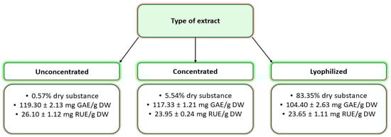 Chemical composition of EDB extracts. Values are reported as mean (n = 3) ± standard deviation (GAE—gallic acid equivalent; RUE—rutin equivalent; and DW—dry weight).