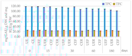 The effect of storage on the extracts over the time on TPC (mg GAE/g DW EDB) and TFC (mg RUE/g DW EDB). Values are reported as mean (n = 3) ± standard deviation (UE—unconcentrated extract; CE—concentrated extract; UEF—unconcentrated extract stored in the freezer; UER—unconcentrated extract stored in the refrigerator; CEF—concentrated extract kept in the freezer; CER—concentrated extract kept in the refrigerator; TPC—total phenolic content; TFC—total flavonoid content; GAE—gallic acid equivalent; RUE—rutin equivalent; and DW—dry weight).
