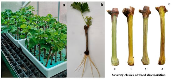 One-node vine cuttings (~15 cm length) from the same cane used for the assessment of vessel sizes were artificially inoculated with the CIA43.2 strain. The basal 2 cm portion of cuttings, soon after cut, was immersed in 100 mL of conidial suspension (105 conidia mL−1) and maintained for 24 h at 25 °C. Water was used for mock-inoculated canes as a control. Then, according to the protocol described by Ayres et al. [22], with a few adaptations, cuttings were placed vertically in holes in perforated polystyrene panels floating on 2 L of distilled water in plastic trays (54 cm × 38.5 cm), ensuring that a 2 cm basal portion of each cutting was constantly immersed in water (Figure 1a). Trays were maintained in a glasshouse at 25 ± 3 °C and a relative humidity of 70–80% under natural lighting (photoperiod of about 12 h). We first started with experiment 1 (table-grape varieties), assessing the response to Pch at 30 and 90 days after inoculation (DAIs), so a total of 30 cuttings were used per variety, 15 for each time point. Based on the results observed in experiment 1, in experiment 2 (wine-grape varieties and rootstocks), the response to Pch was assessed only at a single time point (50 DAIs), and 15 replicated cuttings per wine-grape variety and rootstock were used.
