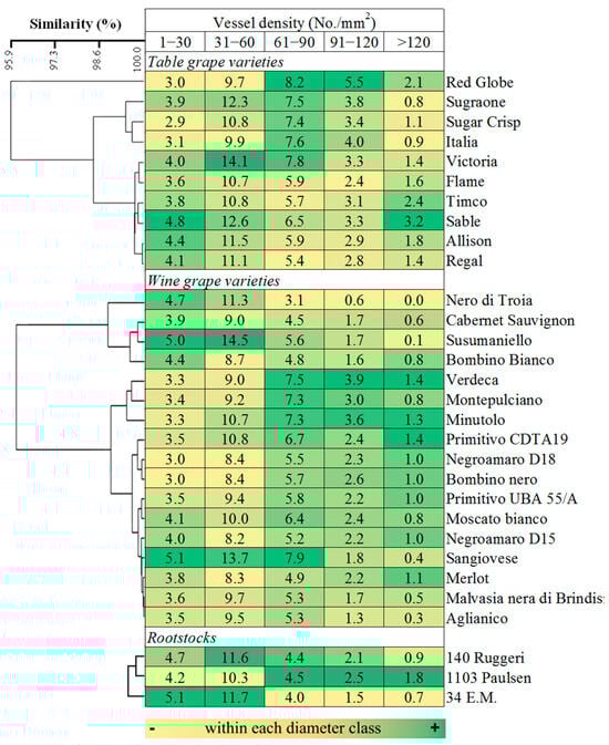 The wine-grape varieties were essentially grouped into two main clusters: one cluster included ‘Nero di Troia’, ‘Cabernet Sauvignon’, ‘Susumaniello’, and ‘Bombino bianco’ (similarity = 98.8%), characterized by higher vessel density in the diameter class <60 µm; and the other cluster included the remaining varieties (similarity = 99.0%) and generally showed a high vessel density in the class >60 µm, with ‘Verdeca’, ‘Minutolo’, and ‘Montepulciano’ showing the highest densities in the classes >90 µm (similarity = 99.5%) and ‘Sangiovese’ showing high vessel density in the class 61–90 µm (Figure 2).