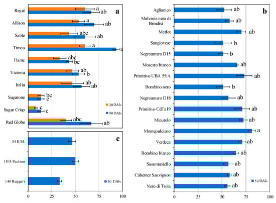 Frequency of isolation on agar media of Phaeomoniella chlamydospora from wood fragments of cuttings of table grapes (a), wine grapes (b), and rootstocks (c) artificially inoculated with the fungus. Data are the mean values obtained by the analysis of 15 cuttings per genotype ± the standard error. For each chart, different letters indicate the statistical difference (p ≤ 0.05) among the genotypes, as determined by Tukey’s test performed in Minitab. In (a), data were elaborated separately for 30 and 90 DAIs.