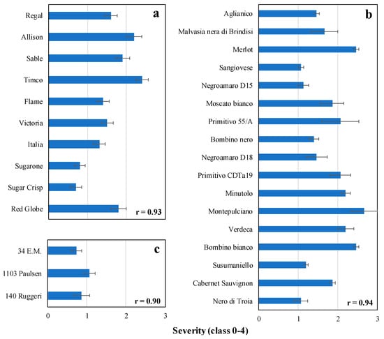 Severity of wood discoloration observed in cuttings of table grapes (a), wine grapes (b), and rootstocks (c) following artificial inoculation with Phaeomoniella chlamydospora. The “r value” within each graph corresponds to the correlation between the severity of wood discoloration and P. chlamydospora isolation frequency (Figure 3). Data are the mean values obtained by the analysis of 15 cuttings per genotype ± the standard error.