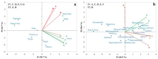 Results of PCA. (a) Table grapes; and (b) wine grapes. The analyzed variables were vessel average diameter (A); density (B); density of vessels with diameter ≥ 120 µm (C); average perimeter (D); severity of wood discoloration (E); frequency of Phaeomioniella chlamydospora isolation on agar media at 30 (table grapes), 50 (wine grapes) (F), and 90 DAIs (G). Variables related to P. chlamydospora are in green, and those related to grapevine vessels are in red. For each biplot, the variables correlated with the principal components F1 and F2 are shown at the top left.