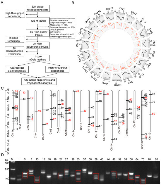 Figure 1. Development of multi-allelic InDel markers in grapevine. (A) Pipeline for grapevine fingerprint database construction based on multi-allelic InDel markers. (B) Gene (black line plot in the outer track) and InDel (red line plot in the inner track) density derived from 499 grape resequencing data across 19 chromosomes. (C) Physical location of 80 high-quality multi-allelic InDels. A total of 24 highly polymorphic primers were labeled in red style. (D) Agarose gel electrophoresis identification of 24 polymorphic InDels selected from the 80 high-quality markers. A total of 11 markers in the red boxes were selected for further analysis.