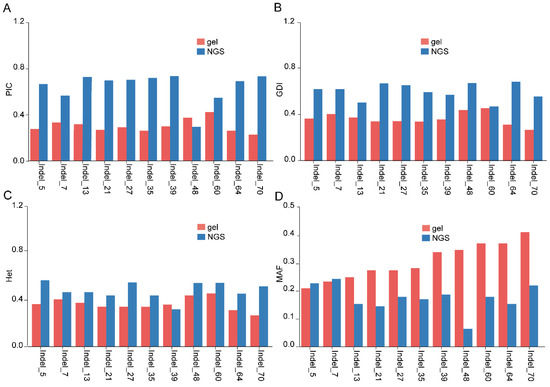 High-quality polymorphic InDel sites were obtained by further filtering using the following criteria: (i) InDels are not on repeat regions in the genome, (ii) multi-allelic InDels, and (iii) the size of an InDel is more than 20 bp. Additionally, the length of the PCR product of the InDel was required to be within the range of 150–300 bp to enable separation by agarose gel electrophoresis. Genetic diversity parameters such as polymorphic information content (PIC), heterozygosity (Het), minor allele frequency (MAF) and gene diversity index (GDI) were calculated using the Python 3.12.4 script (https://github.com/Lvmingjie/indel-seq, accessed on 16 May 2024).