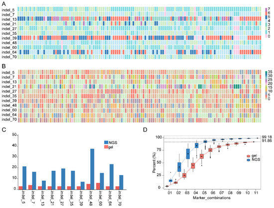 Figure 3. Fingerprinting of 123 grape cultivars. (A) The fingerprints of 123 grape cultivars based on agarose gel electrophoresis results. (B) The fingerprints of 123 grape cultivars based on NGS. (C) The number of genotypes identified by agarose gel electrophoresis and NGS. The y-axis was the genotype number of markers revealed by NGS and gel. (D) The discernibility of different combinations of 11 multi-allelic InDel markers for 123 grape accessions.