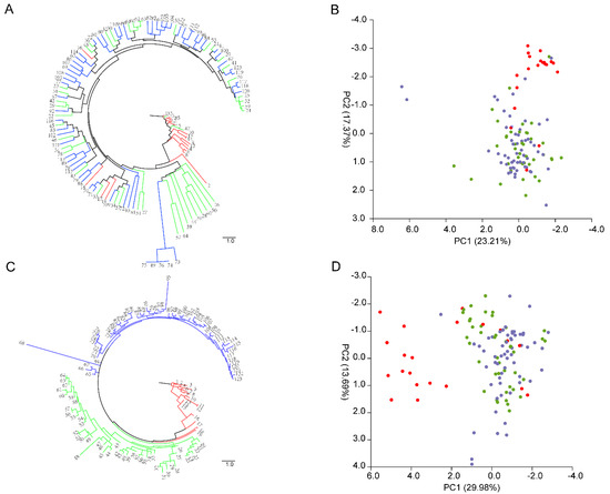 Figure 4. Population structure analysis of 123 grape cultivars. (A) The phylogenetic tree of 123 grape cultivars based on agarose gel electrophoresis results. (B) PCA analysis based on agarose gel electrophoresis results. (C) The phylogenetic tree of 123 grape cultivars based on the NGS results. (D) PCA analysis based on the NGS results. All colors were marked according to the NGS results: Pop−1 (red), Pop−2 (green) and Pop−3 (purple).