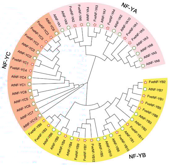 Phylogenetic tree of NF-Y proteins from F. vesca and Arabidopsis thaliana. The tree was constructed based on full-length protein sequences using MEGA11 software. The three NF-Y subunits are marked with different colors. The green circles represent AtNF-Ys, and the red stars represent FveNF-Ys. The numbers for the branches of the tree are bootstrap confidence out of 1000 replications.