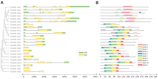 Conserved motifs and gene structure of FveNF-Y family members. (A) Gene structures of FveNF-Y according to their evolutionary relationship. Green boxes represent UTRs, yellow boxes represent CDS, and black lines represent introns. The size of exons and intros can be estimated using the scale at the bottom. (B) Conserved motifs of FveNF-Y proteins. The conserved motifs of the FveNF-Y proteins are indicated by colored boxes.