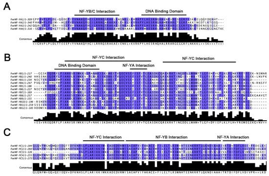 Multiple alignments of strawberry NF-Y conserved domains. The details of conserved domains in the three subfamilies of FveNF-Ys subunit interaction and DNA binding regions of conserved domains are marked. The completely conserved amino acids are colored by blue boxes. Below each figure is the consensus sequence, which represents the position of the last amino acid in its whole protein. (A) FveNF-YA subfamily; (B) FveNF-YB subfamily; and (C) FveNF-YC subfamily.
