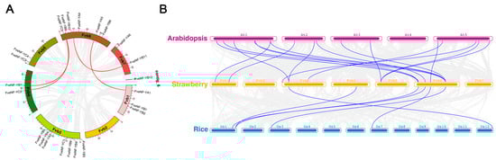 To further investigate the relationship among the FveNF-Y genes, their synteny with NF-Y genes from a monocotyledonous plant (rice) and one monocotyledonous plant (Arabidopsis) was examined (Figure 4B). Among the FveNF-Y genes, a total of 11 exhibited syntenic relationships with AtNF-Y genes, with 6 of them having syntenic loci in rice as well. Specifically, FveNF-YB6, FveNF-YB9, FveNF-YB10, and FveNF-YA5 had syntenic loci in both Arabidopsis and rice (Figure 4B).