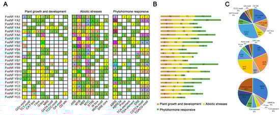 Investigation of all cis-acting elements in FveNF-Ys. (A) Three categories of cis-acting elements in the FveNF-Ys. Different colors and numbers of the gird represent the numbers of different elements in these FveNF-Ys. (B) Histogram of the cis-acting elements in all genes. The different colored histograms represent the total number of the cis-acting elements in each category. (C) Proportion of each promoter element in each category.