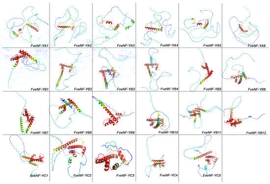 The secondary structures analysis revealed that FveNF-Y proteins exhibit a combination of α-helix, extended chain, and random coil structure. Among these, random coiled amino acids constituted the largest proportion (>38%), followed by α-helix (16.46~56.77%) and extended chain (5.81~28.48%) (Table S5). Three-dimensional structure predictions indicated that the different subfamilies of FveNF-Y share structural similarities, implying potential functional similarities (Figure 6). Specifically, the NF-YA family displayed the simplest structure, while the structures of NF-YB and NF-YC were comparatively more complex.