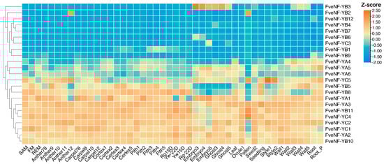 Transcripts Per Million (TPM) values for each FveNF-Y gene in various tissues and stages were extracted from the transcriptome datasets in our previous study [33]. The corresponding TPM values for each FveNF-Y gene in different tissues and stages can be found in Table S1. A heatmap was generated based on the normalized expression values of each FveNF-Y gene.