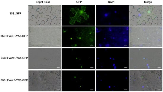 Transcription factors, which play a critical role in regulatory functions, are predominantly located in the nucleus. To further explore this phenomenon in the strawberry, the FveNF-YA3, FveNF-YA4, and FveNF-YC5 proteins were transiently expressed as GFP fusion constructs. The control group, transformed with a non-target GFP, showed diffuse GFP signals, indicating non-specific localization. However, when FveNF-YA3, FveNF-YA4, and FveNF-YC5 were expressed, cells displayed a strong nuclear GFP signal, which is a clear contrast to the control group (Figure 8). This pronounced nuclear localization suggests that these proteins, like other transcription factors, mainly localize in the nucleus, further reinforcing their potential roles in nuclear processes.