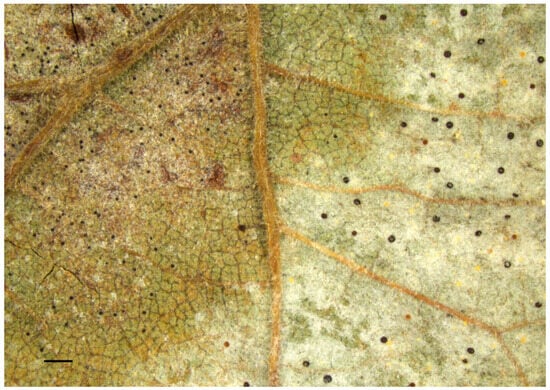 Infection of Corylus avellana by two powdery mildew fungi on same leaf. Sample HPM18 with chasmothecia of E. corylacearum (upper left) and P. guttata (lower right) is shown. Bar: 1 cm.