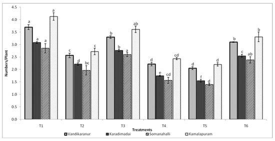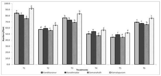 Mean (±SE) number of branches in tomato plants recorded across experimental locations in Tamil Nadu. Bars are means of four replications at each location, and bars followed by the same letter(s) are not significantly different by Tukey’s HSD test (p < 0.05).