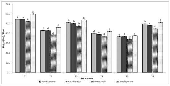 Mean (±SE) plant height (in cm) of tomato plants recorded across experimental locations in Tamil Nadu. Bars are means of four replications at each location, and bars followed by the same letter(s) are not significantly different by Tukey’s HSD test (p < 0.05).