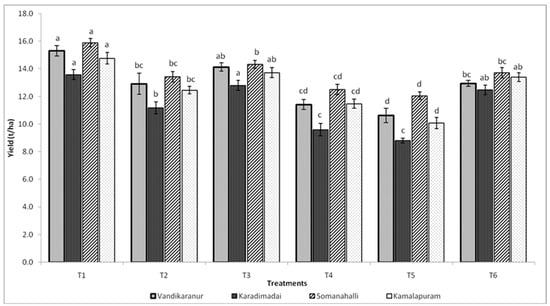 Mean (±SE) tomato fruit yield (t/ha) recorded in four different locations in Tamil Nadu, among the different grafting and IPDM combination treatments. Bars are means of four locations at each location, and bars followed by the same letter(s) are not significantly different by Tukey’s HSD test (p < 0.05).