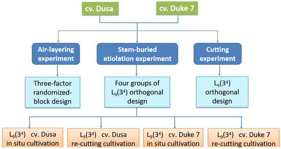 After a series of preliminary trials, three experiments were conducted from March to July 2018 in the present study. They were called as air-layering, direct cutting, and stem-buried etiolation. The first experiment was performed in trees for three months and then continued in a greenhouse (the layering shoots were cut and moved to the greenhouse for further culture); the latter two were conducted in the greenhouse, with an average of 25 °C and >70% humidity (recorded by temperature and humidity recorders, ZDR-20, Hangzhou Zida Instrument Co., Ltd., Hangzhou, China Figure 1). The entire experimental design is graphically described in Figure 2. All treatments were repeated three times with a randomized block and/or orthogonal experimental design.
