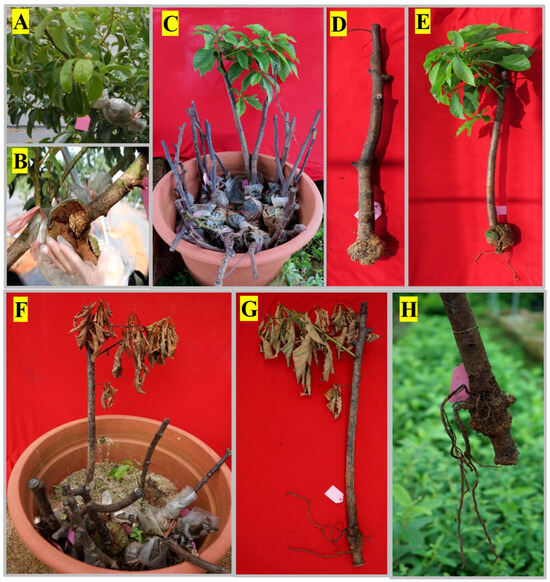 The process of the air-layering experiment. (A) A ring bark was removed and bagged with medium at the shoot base; (B) calli formed at the bark end; (C) layering shoots cultivated in sand-pots; (D–H) roots could not formed or were thin and frail and ultimately lost viability.