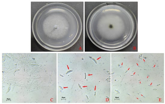 Morphological characteristics of the F2 strain of strawberry red core root disease. Note: (A) Colony on PDA (top); (B) colony on PDA (bottom); (C) morphology and size of the mycelia; (D) morphology and size of the macroconidia; (E) morphology and size of the microconidia. Note: The red arrows in (D,E) indicate macroconidium and microconidium, respectively.