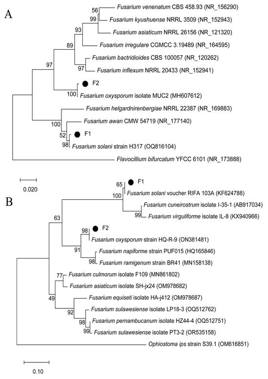 The first phylogenetic tree of the F1 strain and F2 strain was constructed based on their ITS gene sequence (Figure 4A). The sequence similarity between the F1 strain and F. solani (registration number: OQ816104.1) reached 99%. The sequence similarity between the F2 strain and F. oxysporum (registration number: MH607612) reached 100%.