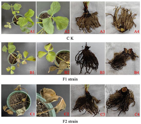Symptoms of strawberry red core root disease caused by inoculation with F1 strain and F2 strain. Note: (A1–A4): leaf parts, roots, and stem cross-sections of control group strawberry plant; (B1–B4): leaf parts, roots, and stem cross-sections of strawberry plant inoculated with F1 strain; (C1–C4): leaf parts, roots, and stem cross-sections of strawberry plant inoculated with F2 strain.
