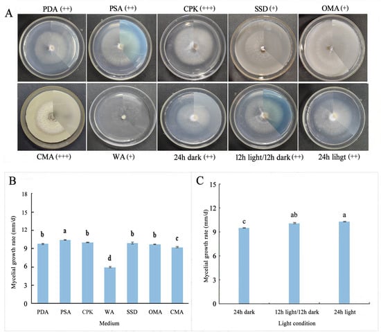 Similarly, fungal plugs were tested at pH values of 4, 5, 6, 7, 8, 9, and 10, which were adjusted using HCl (1 Mol·L−1) and sodium hydroxide (NaOH) (1 Mol·L−1) under aseptic conditions, and then incubated at 25 °C. There were five replicates per pH value. Additional plates of fungal plugs were tested at full light, full darkness, and alternating light and darkness (L/D = 12 h/12 h) in a 25 °C incubator.