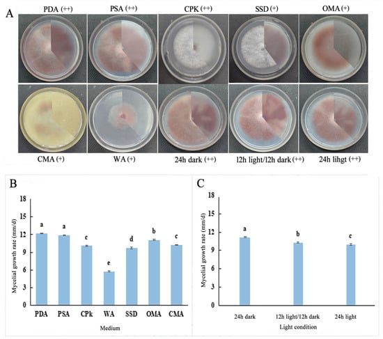 Effect of different media and light conditions on the mycelial growth of Fusarium oxysporum. (A) Colony morphology under different media and light conditions; (B) mycelial growth rate under different media; (C) mycelial growth rate under different light conditions. Note: The small letters indicate that the difference is significant (p ≤ 0.05); ++ indicates that the mycelia grow ordinarily, + indicates that the mycelia grow weakly and sparsely.