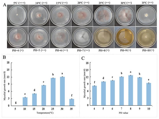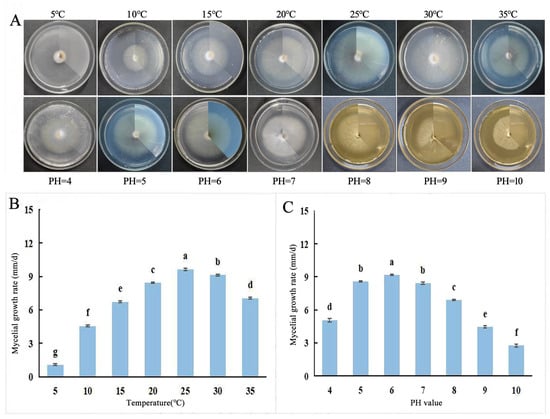Effect of different temperatures and pH values on the mycelial growth of Fusarium solani. (A) Colony morphology under different temperatures and pH values; (B) mycelial growth rate under different temperatures; (C) mycelial growth rate under different pH values. Note: The small letters indicate that the difference is significant (p ≤ 0.05).