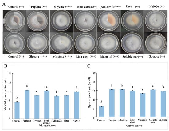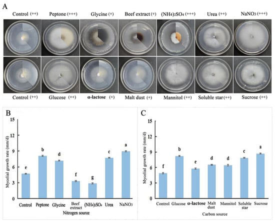 Effect of different carbon and nitrogen sources on the mycelial growth of Fusarium oxysporum. (A) Colony morphology under different carbon and nitrogen sources; (B) mycelial growth rate under different nitrogen sources; (C) mycelial growth rate under different carbon sources. Note: The small letters indicate that the difference is significant (p ≤ 0.05); +++ indicates that the mycelia grow vigorously and densely ++ indicates that the mycelia grow ordinarily, + indicates that the mycelia grow weakly and sparsely.
