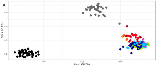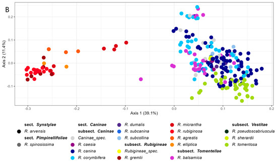 A PCoA analysis was performed on the whole dataset to visualize the genetic structure and relationships among the samples. The first two coordinates of PCoA explained 59.7% of the variation (Figure 1A). As expected, three distinct clusters were formed, dividing samples of the non-dogrose species R. arvensis and R. spinossisima from each other and from the Caninae section. When performing a second PCoA analysis with only samples from the Caninae section, the “rub” group (subsection Rubigineae) was separated from the “can” group (species of subsections Canineae, Vestitae, and Tomentellae) along the first axis (Figure 1B). Within these two clusters, the species appear to be intermixed.