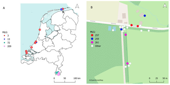 (A) Two repeated (clonal) multilocus genotypes (MLG3 and MLG13) in the species complex comprising R. micrantha, R. gremlii, and R. rubiginosa. The two genotypes occur at several sites (indicated by dots) along the coast from the northern island of Schiermonnikoog to the south of the Netherlands. The number in the dots indicates the number of individuals at the site. (B) Repeated (clonal) MLGs within R. tomentosa populations occur mingled with other genotypes (POP26 as example). Coloured dots indicate different repeated MLGs. White dots indicate unique genotypes.