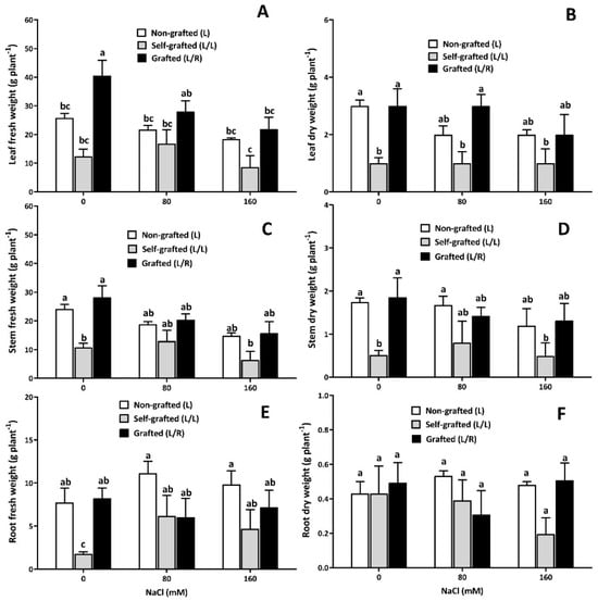 Plant growth-related properties as a function of NaCl dose. Fresh and dry weights of leaves (A,B), stems (C,D), and roots (E,F) (g.plant−1) for plants corresponding to treatments L (ungrafted Old Limachino tomato), L/L (self-grafted Old Limachino tomato), and L/R (grafted Old Limachino tomato on INIA JUPAFORT1 rootstock) grown under three salinity treatments: 0 mM of NaCl; 80 mM of NaCl, and 160 mM of NaCl for 21 days (DAT). Each value is the mean of six replicates, and vertical bars are S.E. Lowercase letters represent differences (p ≤ 0.05 Duncan’s test) between treatments and grafting types.