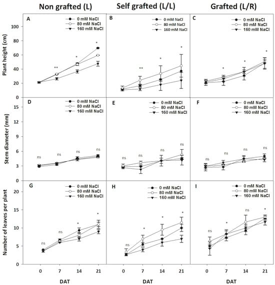 The evolution of plant morphological parameters during exposure to different NaCl doses. The plant height (cm; A–C), basal stem diameter (mm; D–F), and number of leaves per plant (G–I) for plants corresponding to treatment L (ungrafted Old Limachino tomato), L/L (self-grafted Old Limachino tomato), and L/R (grafted Old Limachino tomato on INIA JUPAFORT1 rootstock) grown under three salinity treatments: 0 mM of NaCl; 80 mM of NaCl, and 160 mM of NaCl for 1, 7, 14, and 21 days after beginning treatment (DAT). Each value is the mean of six replicates, and vertical bars are S.E. Multifactorial ANOVA test: (*) p ≤ 0.05, and p ≤ 0.01 (**), by date; ns: non significant.
