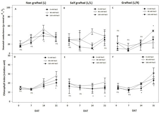 The evolution of the stomatal conductance and chlorophyll content index during exposure to different NaCl doses. Stomatal conductance (gs, mmol m−2 s−1 A–C) and chlorophyll index (%; D–F) for plants corresponding to treatment L (ungrafted Old Limachino tomato), L/L (self-grafted Old Limachino tomato), and L/R (grafted Old Limachino tomato on INIA JUPAFORT1 rootstock) grown under three salinity treatments: 0 mM of NaCl; 80 mM of NaCl, and 160 mM of NaCl at 1, 7, 14, and 21 days after beginning treatment (DAT). Each value is the mean of six replicates, and vertical bars are S.E. Multifactorial ANOVA test: (*) p ≤ 0.05, by date. ns: non significant.