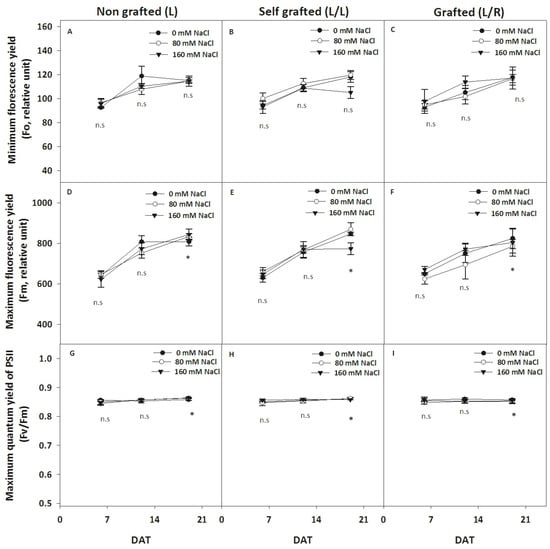 The evolution of chlorophyll fluorescence-related parameters during exposure to different NaCl doses. The basal (F0, relative unit; A–C) and maximum (Fm, relative unit; D–F) fluorescence and maximum PSII yield (Fv/Fm, G–I) in leaves for plants corresponding to treatment L (ungrafted Old Limachino tomato), L/L (self-grafted Old Limachino tomato), and L/R (grafted Old Limachino tomato on INIA JUPAFORT1 rootstock) grown under three salinity treatments: 0 mM of NaCl; 80 mM of NaCl, and 160 mM of NaCl at 6, 13, and 20 days after the beginning of the treatment (DAT). Each value is the mean of six replicates, and vertical bars are S.E. Multifactorial ANOVA test: (*) p ≤ 0.05, n.s, non significant.