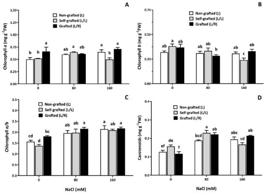 The pigment concentration as a function of the NaCl dose. Chlorophyll (Chl) a (A) and b (B) contents, chlorophyll a/b ratio (C), and carotenoids (D) for plants corresponding to treatment L (ungrafted Old Limachino tomato), L/L (self-grafted Old Limachino tomato), and L/R (grafted Old Limachino tomato on INIA JUPAFORT1 rootstock) grown for 21 days under three salinity treatments: 0 mM of NaCl; 80 mM of NaCl, and 160 mM of NaCl. Each value is the mean of six replicates, and vertical bars are S.E. Lowercase letters represent differences (p ≤ 0.05 Duncan’s test) between treatments and grafting types.
