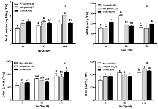 The total proteins (mg g−1 FW; (A)), malondialdehyde (MDA; nmol g−1 FW, (B)), and antioxidant capacity: DPPH (2,2-diphenyl 1-picrylhydrazyle, (C)) and FRAP (ferric-reducing antioxidant power (D)) (mM Trolox equivalent TE.g−1 FW) in leaves for plants corresponding to treatment L (ungrafted Old Limachino tomato), L/L (self-grafted Old Limachino tomato), and L/R (grafted Old Limachino tomato on INIA JUPAFORT1 rootstock) grown for 21 days under three salinity treatments: 0 mM of NaCl; 80 mM of NaCl, and 160 mM of NaCl. Each value is the mean of six replicates, and vertical bars are S.E. Lowercase letters represent differences (p ≤ 0.05 Duncan’s test) between treatments and grafting types.
