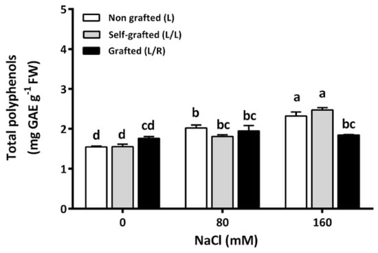 The leaf total polyphenols concentration (mg GAE (gallic acid equivalent) g−1 FW) for plants corresponding to treatment L (ungrafted Old Limachino tomato), L/L (self-grafted Old Limachino tomato), and L/R (grafted Old Limachino tomato on INIA JUPAFORT1 rootstock) grown for 21 days under three salinity treatments: 0 of NaCl; 80 of NaCl, and 160 of NaCl). Each value is the mean of six replicates, and vertical bars are S.E. Lowercase letters represent differences (p ≤ 0.05 Duncan’s test) between treatments and grafting types.