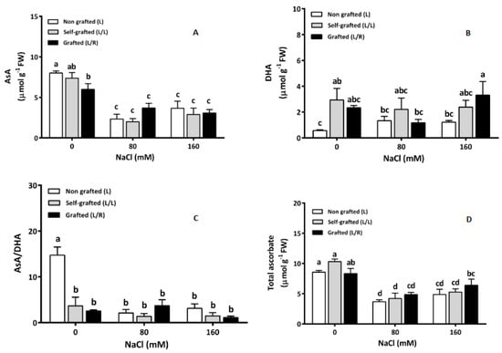 Reduced ascorbic acid (AsA; μmol g−1 FW; (A)) and dehydroascorbate (DHA; μmol g−1 FW; (B)), AsA/DHA (C) and total ascorbate (μmol g−1 FW; (D)) in leaves for plants corresponding to treatment L (ungrafted Old Limachino tomato), L/L (self-grafted Old Limachino tomato), and L/R (grafted Old Limachino tomato on INIA JUPAFORT1 rootstock) grown for 21 days under three salinity treatments: 0 mM of NaCl; 80 of NaCl, and 160 of NaCl. Each value is the mean of six replicates, and vertical bars are S.E. Lowercase letters represent differences (p ≤ 0.05 Duncan’s test) between treatments and grafting types.
