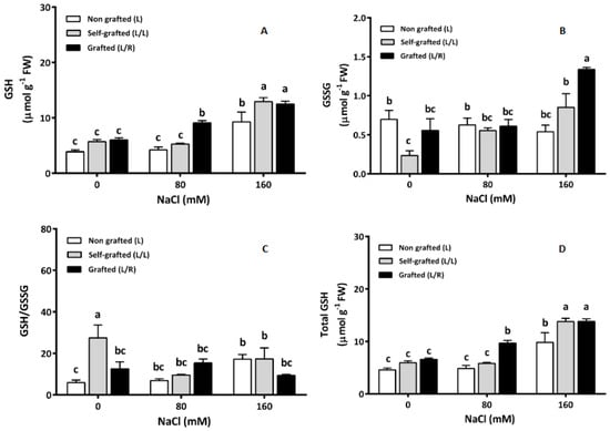 Reduced glutathione (GSH; μmol g−1 FW; (A)) and oxidized glutathione (GSSG; μmol g−1 FW; (B)) concentrations, GSH/GSSG (C), and total GSH concentrations (μmol g−1 FW; (D)) in the leaves of plants corresponding to treatment L (ungrafted Old Limachino tomato), L/L (self-grafted Old Limachino tomato), and L/R (grafted Old Limachino tomato on INIA JUPAFORT1 rootstock) grown for 21 days under three salinity treatments: 0 of NaCl; 80 of NaCl, and 160 of NaCl. Each value is the mean of six replicates, and vertical bars are S.E. Lowercase letters represent differences (p ≤ 0.05 Duncan’s test) between treatments and grafting types.