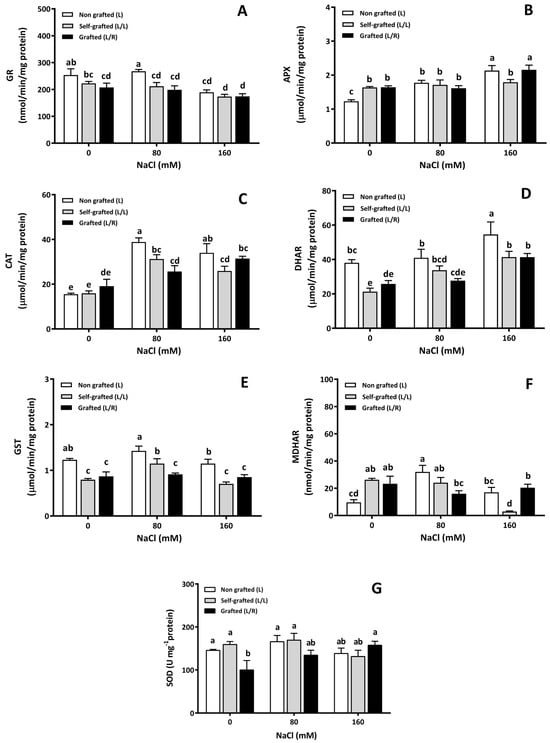 The antioxidant enzyme activity as a function of different NaCl doses. The enzymatic activity of antioxidant enzymes (glutathione reductase (GR; (A)), ascorbate peroxidase (APX; (B)), catalase (CAT; (C)), dehydro-ascorbate reductase (DHAR; (D)), glutathione-S-transferase (GST; (E)), monodehydroascorbate reductase (MDHAR; (F)), and superoxide dismutase (SOD; (G))) in leaves of plants corresponding to treatment L (ungrafted Old Limachino tomato), L/L (self-grafted Old Limachino tomato), and L/R (grafted Old Limachino tomato on INIA JUPAFORT1 rootstock) grown for 21 days under three salinity treatments: 0 of NaCl; 80 of NaCl, and 160 of NaCl. Each value is the mean of six replicates, and vertical bars are S.E. Lowercase letters represent differences (p ≤ 0.05 Duncan’s test) between treatments and grafting types.