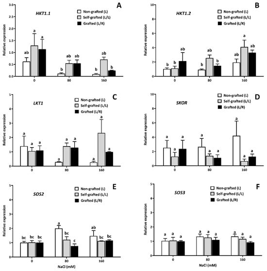 The expression of gene coding for the ion transporter as a function of the NaCl dose. The gene expression in the roots (relative units) of the Na+ transporter HKT1.1 (HKT1.1, (A)), Na+ transporter HKT1.2 (HKT1. 2, (B)), potassium channel SKOR-like (SKOR, (D)); potassium channel (LKT1, (C)), calcineurin B-like interacting protein kinase (SOS2, (E)), and calcium sensor calcineurin B-like (SOS3, (F)) for plants corresponding to treatment L (ungrafted Old Limachino tomato), L/L (self-grafted Old Limachino tomato), and L/R (grafted Old Limachino tomato on INIA JUPAFORT1 rootstock) grown under three salinity treatments: 0 of NaCl, 80 of NaCl, and 160 of NaCl at 21 days after beginning treatment (DAT). Each value is the mean of three replicates, and vertical bars are S.E. Lowercase letters represent differences (p ≤ 0.05 Duncan’s test) between treatments and types of graftings.